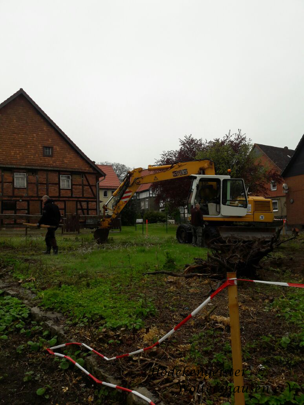 Am vergangenen Wochenende wurde dann in einer großen Gemeinschaftsaktion mit vielen Helfern das Gelände ca. 70 cm tief ausgebaggert, um den Unterbau herstellen zu können. Eine Baufirma hatte den Bagger zur Verfügung gestellt und die Woltershäuser Landwirte fuhren mit ihren Fahrzeugen den Mutterboden ab. Wer am weiteren Ausbau des Woltershäuser Dorfplatzes interessiert ist, kann sich jederzeit auf der Homepage der „Hödekengeister“ www.woltershausen.com informieren. Dort kann man auch alles über das Dorf und seine Geschichte erfahren.