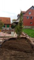 Heute morgen wurde bereits um 8.30 Uhr mit den letzten Pflasterarbeiten begonnen. Die schmale Auffahrt, aus Richtung Mittelstraße kommend, ist nun auch fertig. Die Rasenkantensteine für die Einfassung der Büsche stehen und die letzten Ecken sind festgerüttelt. Die letzten Feinarbeiten, wie das Verfugen der Wesersandsteine wird nach und nach fertiggestellt. Eine letzte obere Reihe wird noch mit kleineren Wesersandsteinen auf die hintere rechte Seite gesetzt, um den Höhenunterschied auszugleichen.