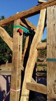 Das bedeutet, dass jeder Dachsparren, je nach Form ( rund, eckig oder eben wie gewachsen ) haargenau eingearbeitet werden muss. Insgesamt sind es 12 Dachsparren, die mit 300mm Schrauben an der Firstfette und den seitlichen Balken gefestigt werden. Die unteren Enden der Dachsparren werden dann noch in Form gebracht.