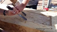 Aber bereits am folgenden Morgen ab 9 Uhr wurde fleißig weiter gewerkelt. Alle restlichen vertikalen Balken, die Ständer und horizontalen Balken, die Riegel, wurden verzapft und werden abschließend mit Holznägeln verbunden. Um dem Ganzen die nötige Stabilität zu geben, wurden die Balken auf „Zug“ gebracht, das heißt mit Bändern fest verzurrt. Eine besonders schwierige Angelegenheit war das Setzen der sogenannten Bänder oder Schwerterpfosten. Diese werden quer zwischen den Eckpfosten und den Ständern gesetzt. Auch diese wurden schon genauso in ihren „alten Häusern“ verwendet und bekommen nun wieder genau den gleichen Endpunkt. Viele Zapfenlöcher mussten per Hand mit einem Holzspatel nachgearbeitet werden. Teilweise kam auch noch eine Kettensäge zum Einsatz. Alles musste auf den Millimeter genau ausgearbeitet werden, damit am Ende alles richtig zusammen passt.