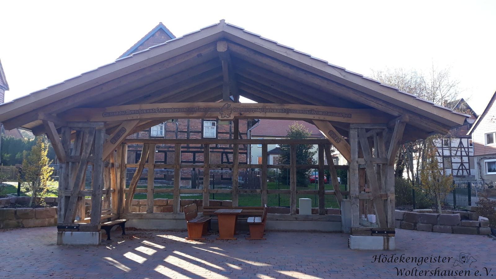 Vor gut einem Jahr hatte die damals noch selbstständige Gemeinde Woltershausen eine an den Dorfplatz im Mitteldorf angrenzende 200 m² große Gartenfläche erworben. Der Heimatverein „Hödekengeister“, unter Leitung des ersten Vorsitzenden Arne Kiehne, hatte sich dann bereit erklärt, die Fläche in eigener Regie an den Dorfplatz anzugliedern und darauf eine, zum Platz hin offene, Hütte für dörfliche Veranstaltungen zu errichten.